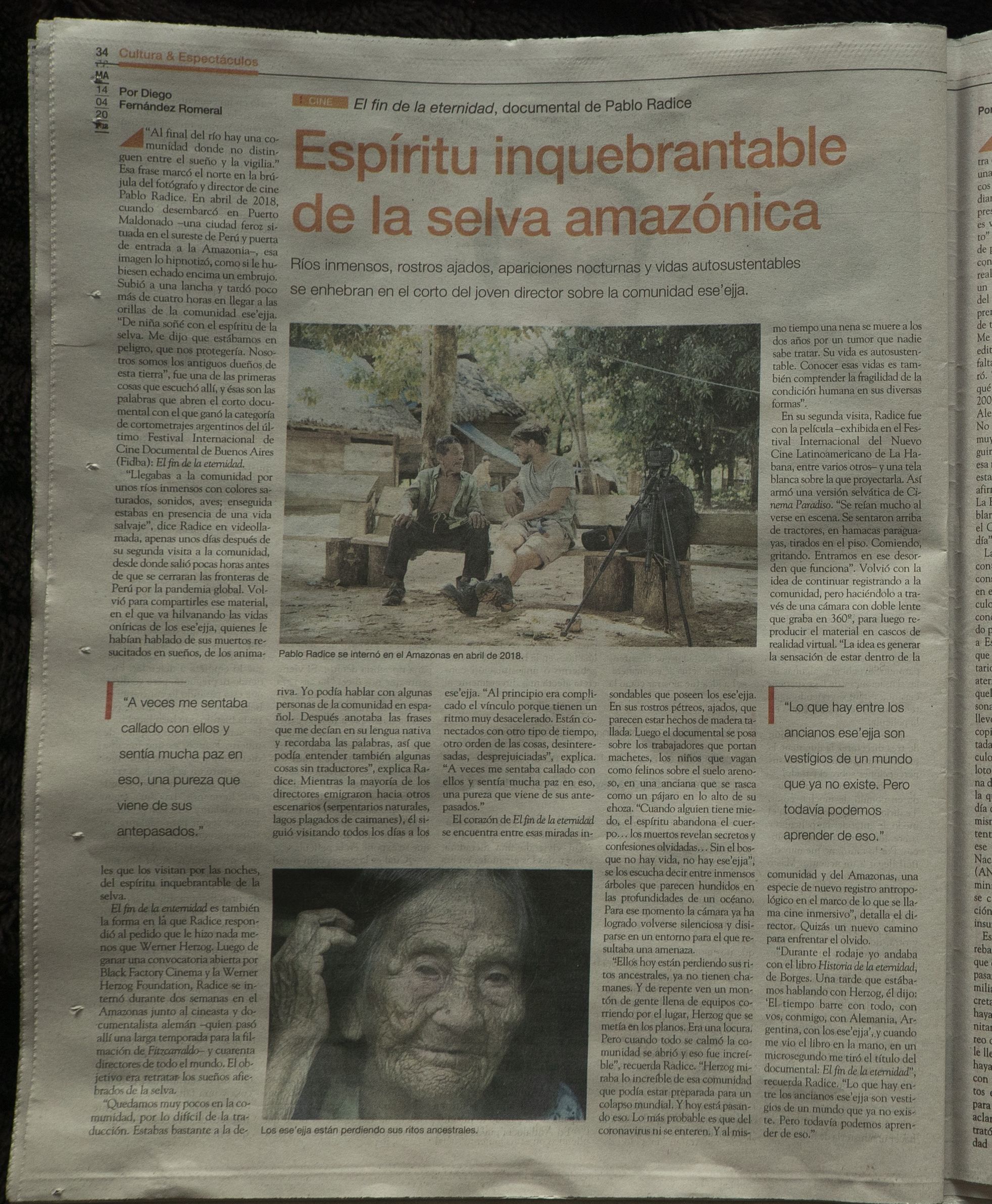 Bajo la tutela de Werner Herzog, decidí hacer un cortometraje en la comunidad amazónica peruana Ese Eja, en Palma Real. Una película sobre los mitos, la muerte y los sueños como vehículo de resistencia y lucha contra el advenimiento del tiempo mezquino, envidioso de las cosas de este mundo.